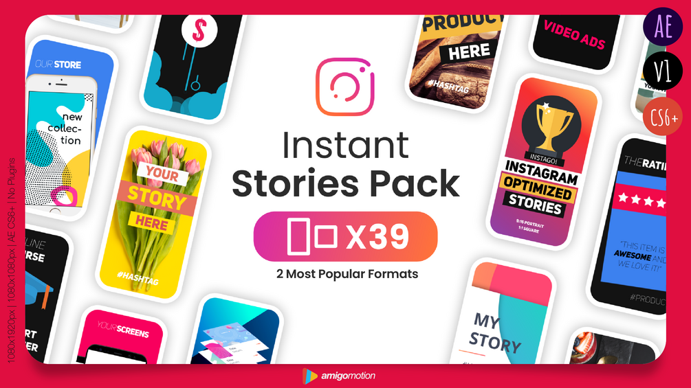 Instant Stories Pack features 39 Instagram Stories in 2 most popular formats: 9:16 Portrait, and 1:1 Square.